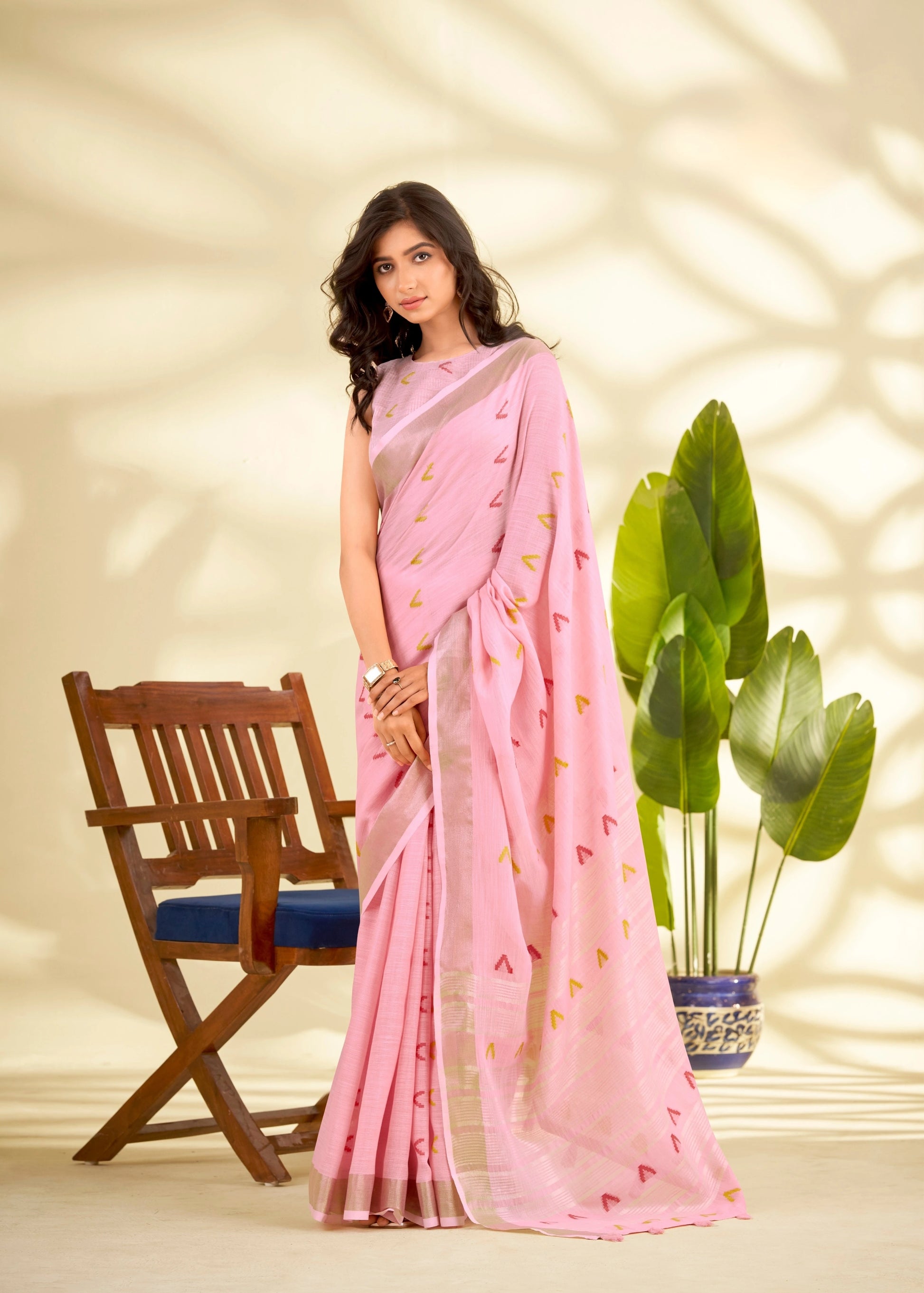 Pink Handloom-Style Weaving Linen Silk Saree