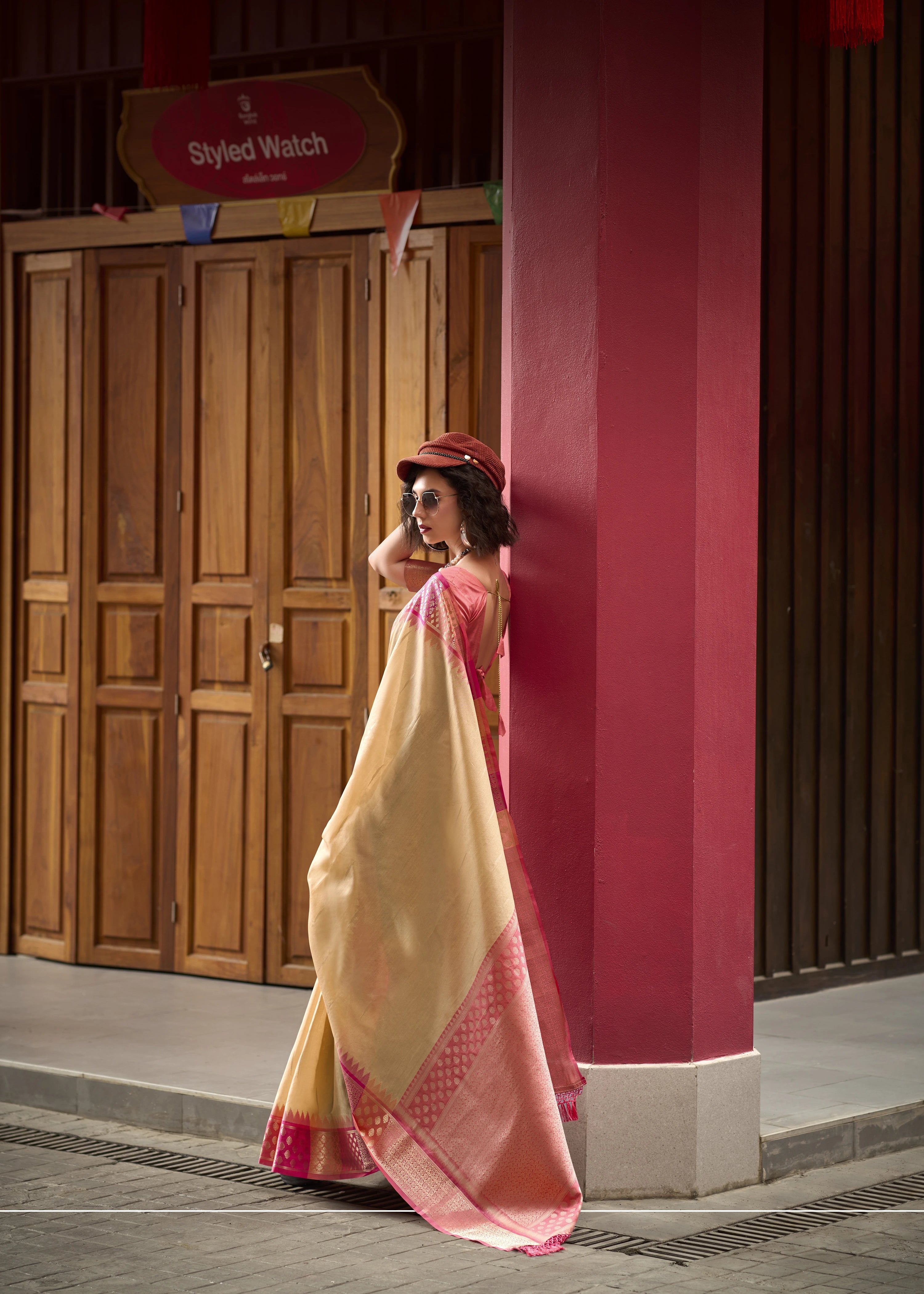 Elevate your elegance with this Beige Banarasi Silk Saree, meticulously crafted with intricate zari weaving. The luxurious silk fabric combined with traditional Banarasi artistry offers a graceful drape and timeless appeal, perfect for special occasions that call for refined sophistication. Its subtle beige hue enhances the delicate gold zari patterns, creating a harmonious blend of classic beauty and modern poise.