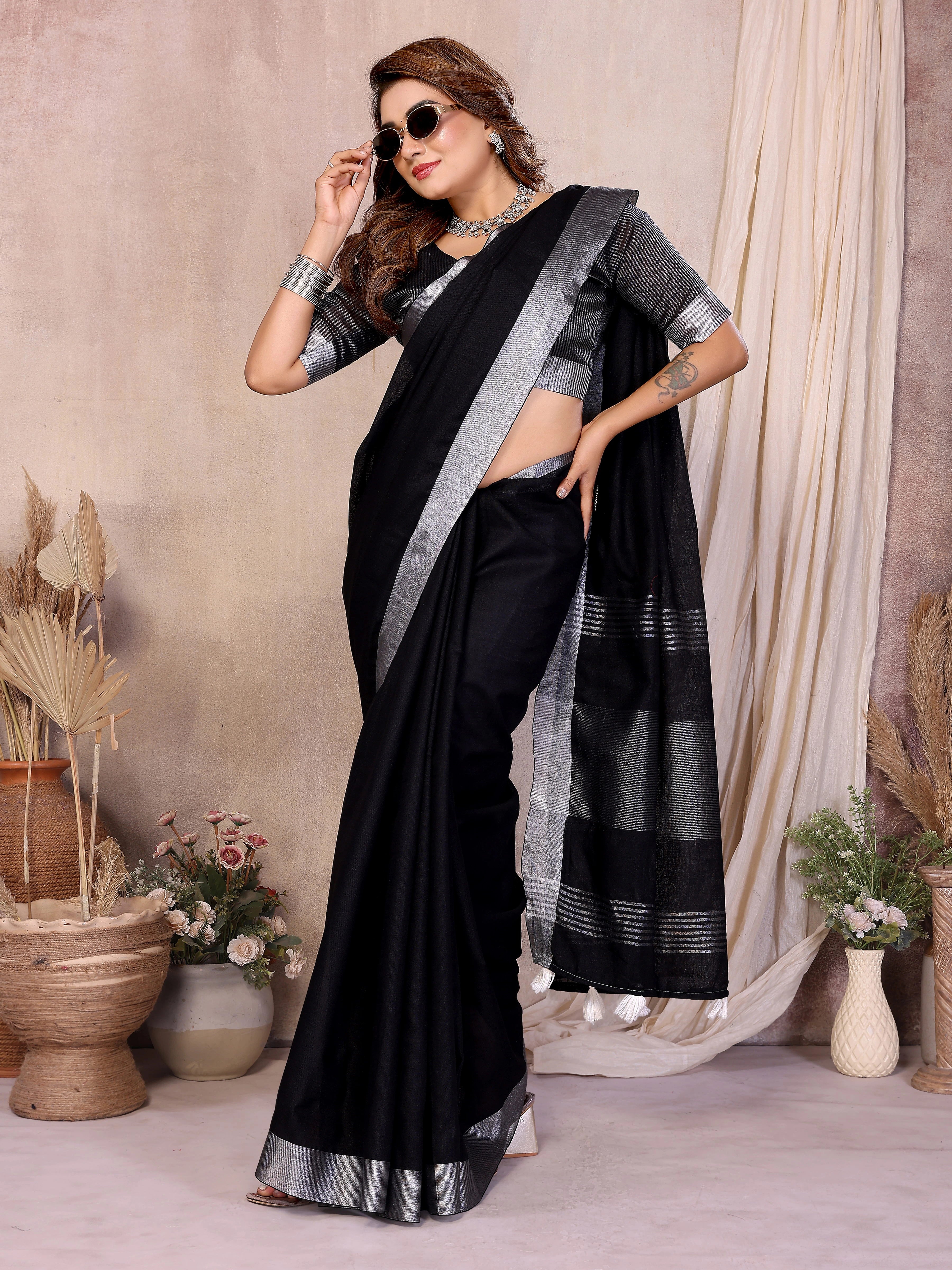 Black Zari Border Soft Linen Cotton Saree Embrace understated luxury with this meticulously crafted black saree, where premium linen-cotton weaving meets refined artisanal detailing. The delicate zari border traces an elegant narrative across the fabric, adding dimension and depth to the serene black canvas.