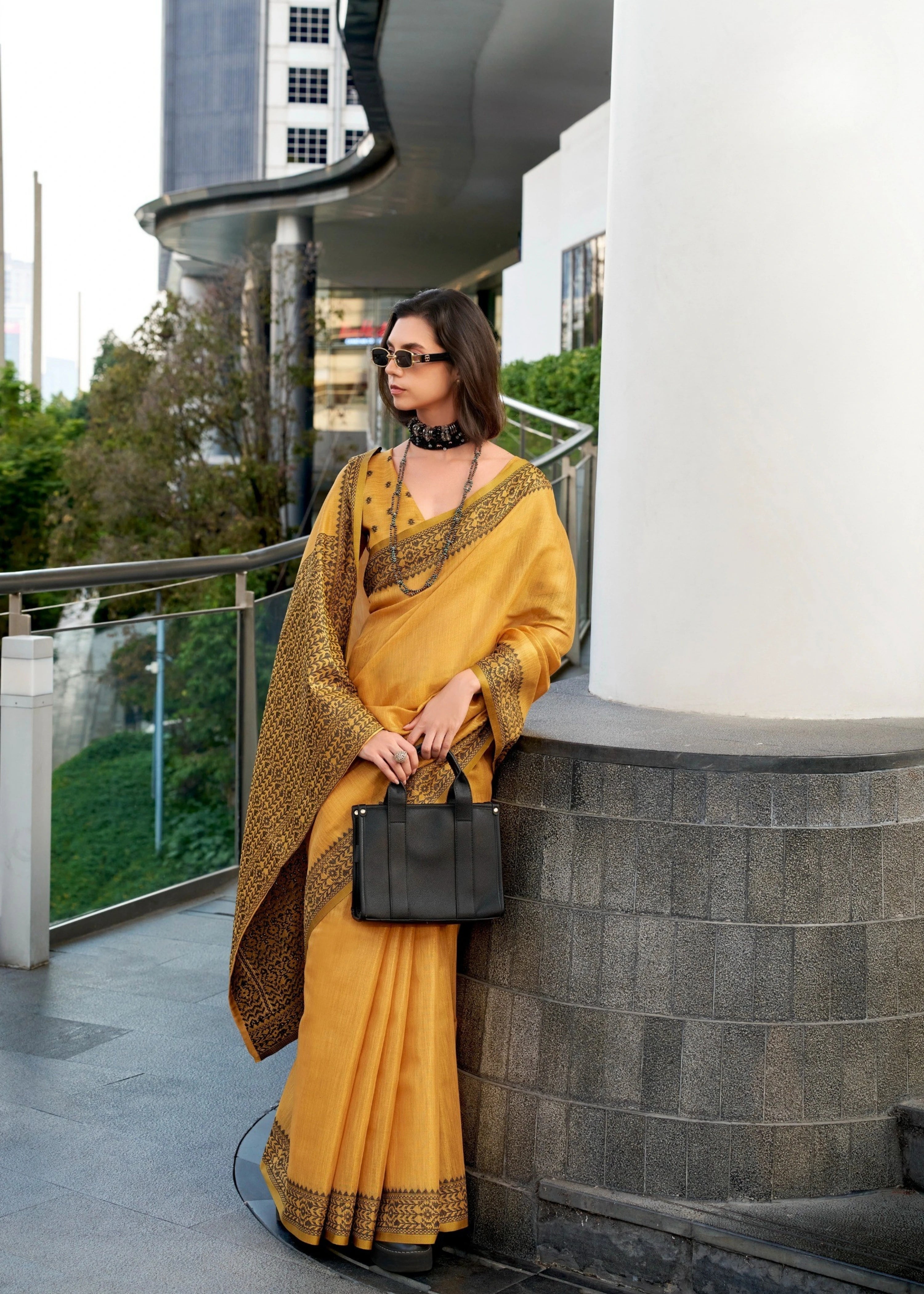 Mustard Yellow Zari Woven Border Linen Tissue Silk Saree