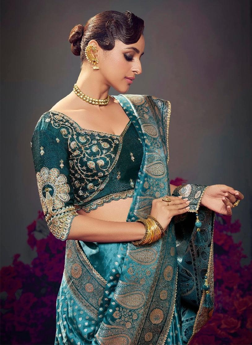 Teal Embroidery Work Satin Silk Saree