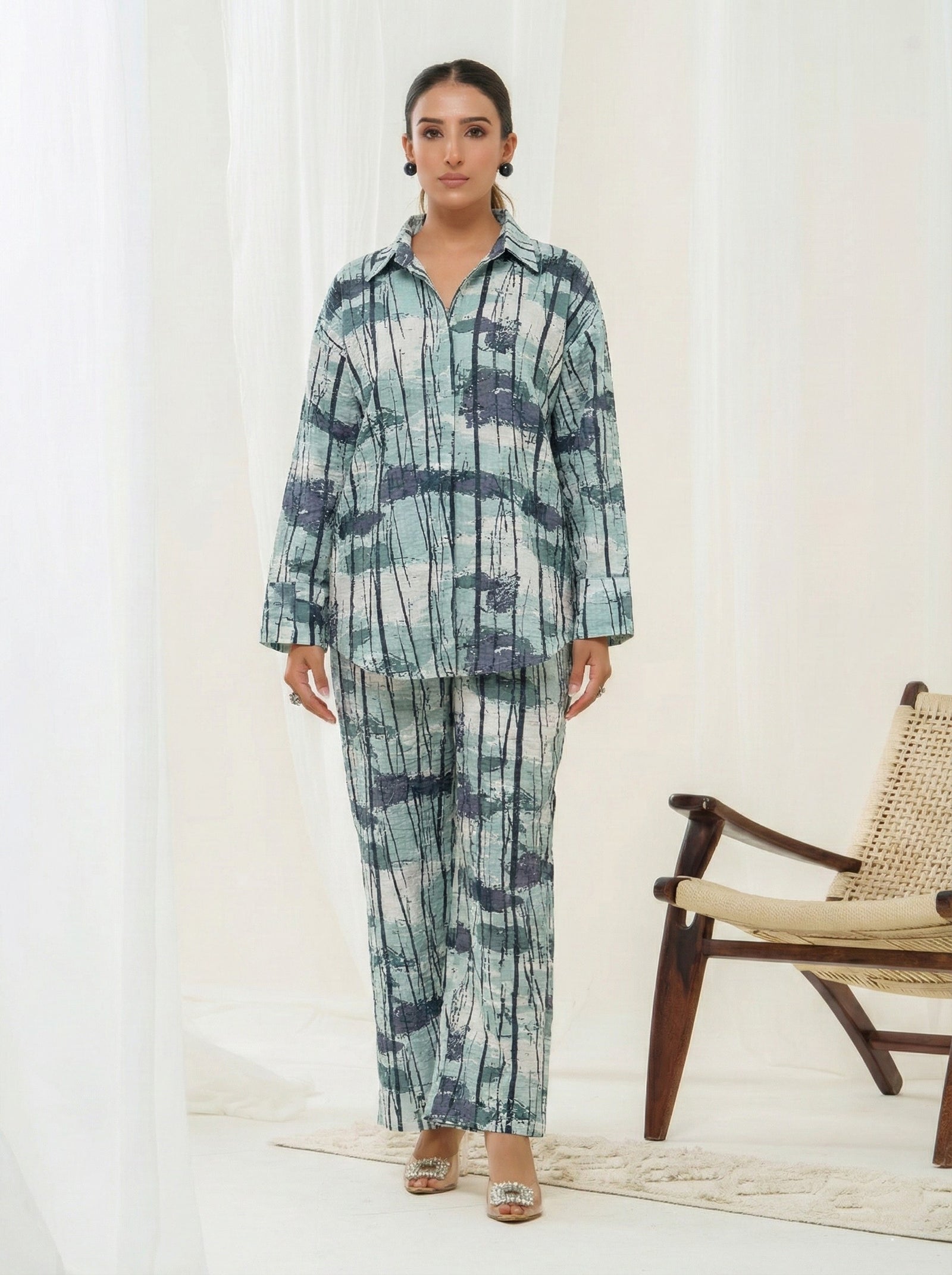 Premium Lycra fabric featuring striking abstract digital prints. Engineered for superior stretch and recovery, it's ideal for cord sets, kurtis, dresses, and gowns. Combines elasticity with refined aesthetics for garments that move with you.