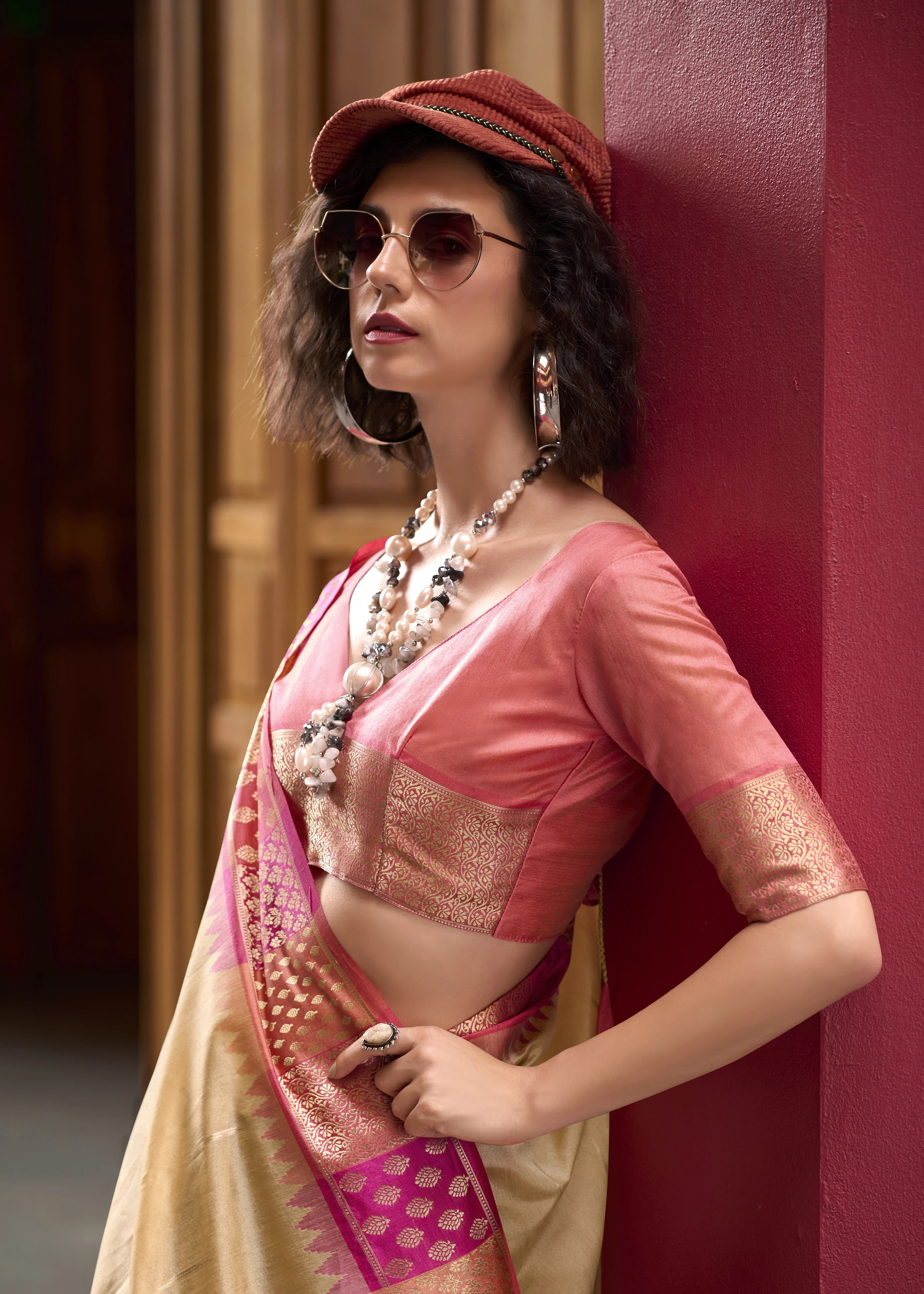 Elevate your elegance with this Beige Banarasi Silk Saree, meticulously crafted with intricate zari weaving. The luxurious silk fabric combined with traditional Banarasi artistry offers a graceful drape and timeless appeal, perfect for special occasions that call for refined sophistication. Its subtle beige hue enhances the delicate gold zari patterns, creating a harmonious blend of classic beauty and modern poise.