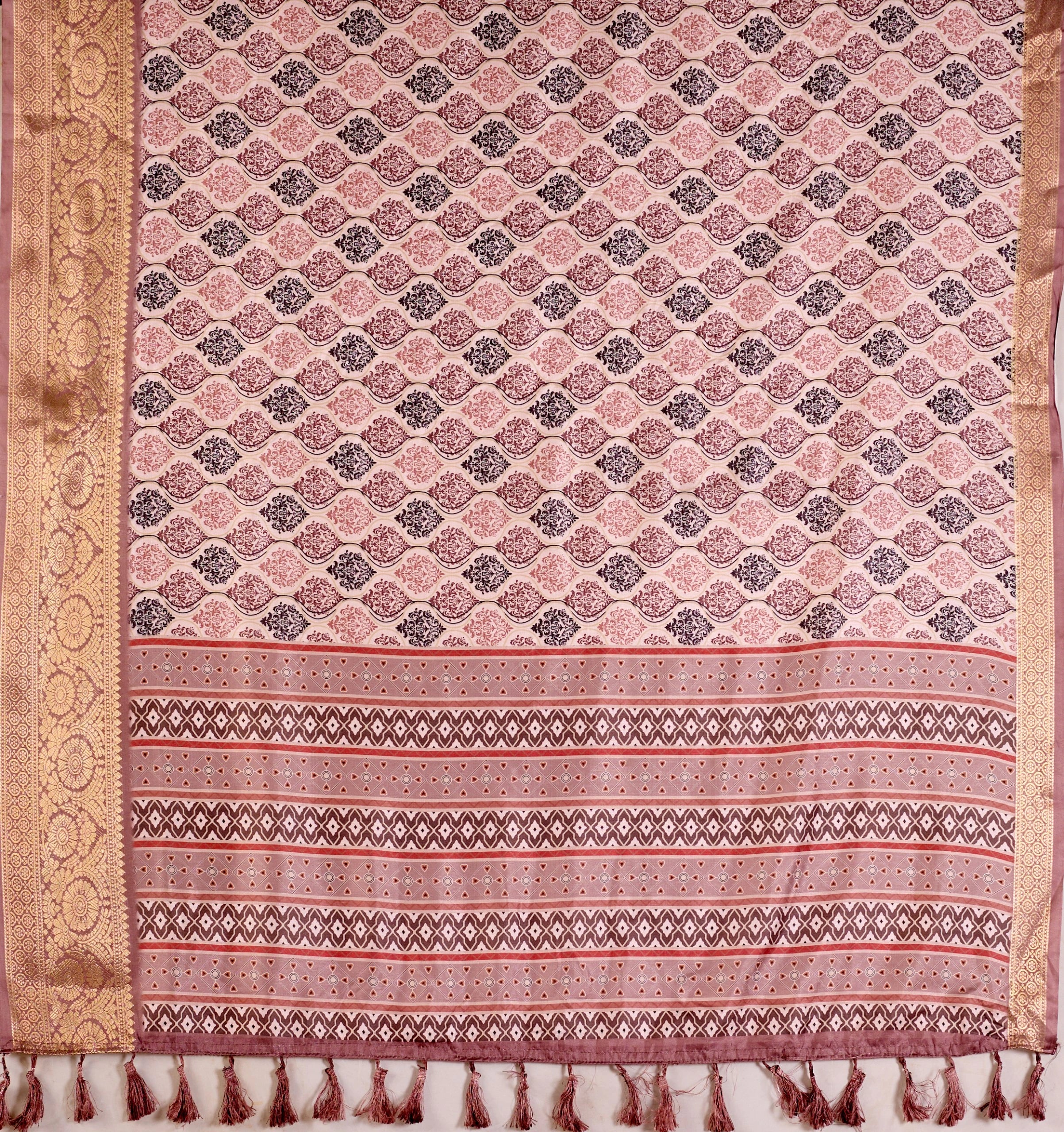 Beige Floral Digital Weaving & Golden Zari Border Soft Lichi Silk