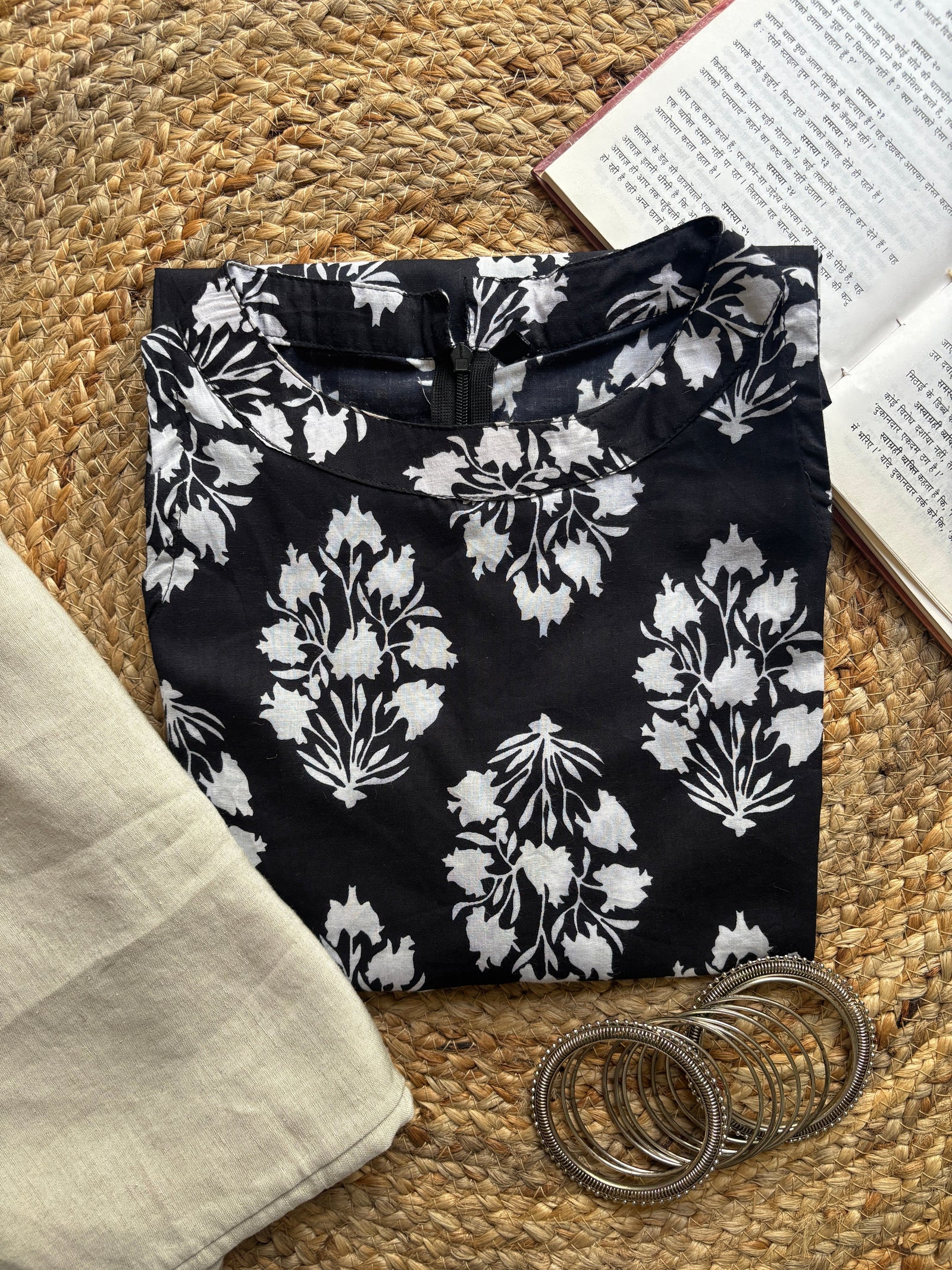 Black Halter Neck Short Kurti with striking white floral embellishment and graceful side tie-up construction. This sleeveless piece showcases a fluid silhouette that moves effortlessly, making it an ideal choice for layering with palazzos or contemporary denim. The contrast print adds visual interest while maintaining an understated elegance, perfect for casual gatherings or relaxed weekend wear.