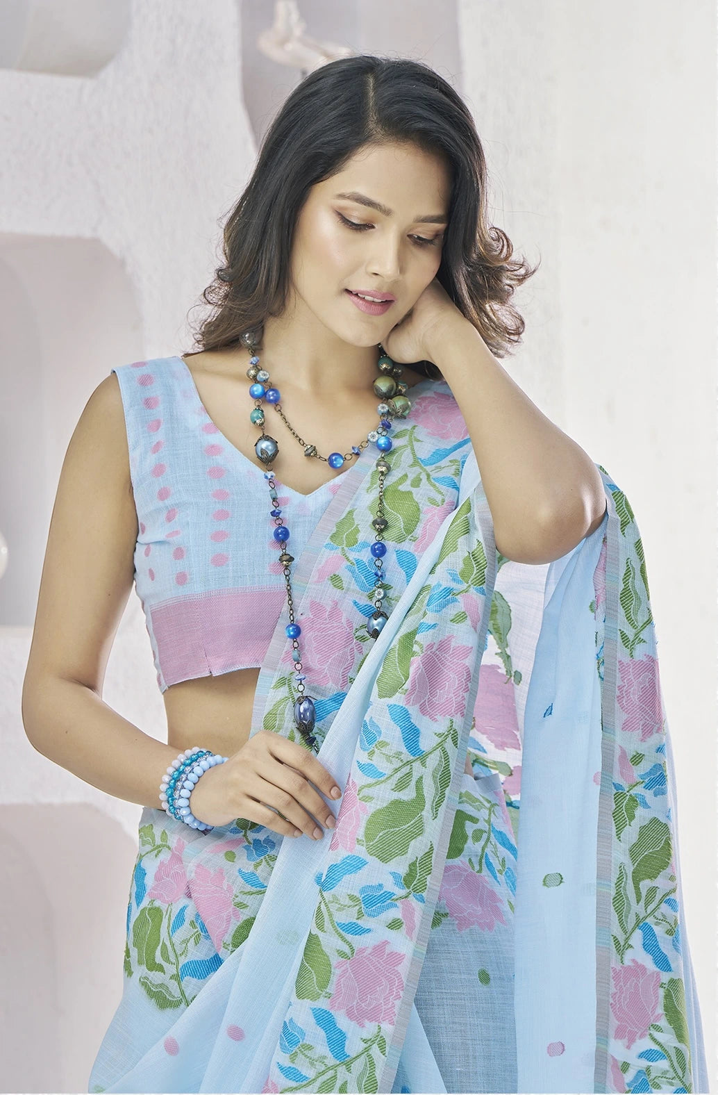 Elevate your wardrobe with this Blue Floral Print Linen Silk Saree, exquisitely blending the softness of linen with the elegance of silk. The delicate floral motifs add a subtle charm, making it perfect for both formal occasions and graceful daytime events. Lightweight and breathable, this saree ensures comfort while enhancing your sophisticated style effortlessly.