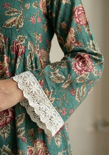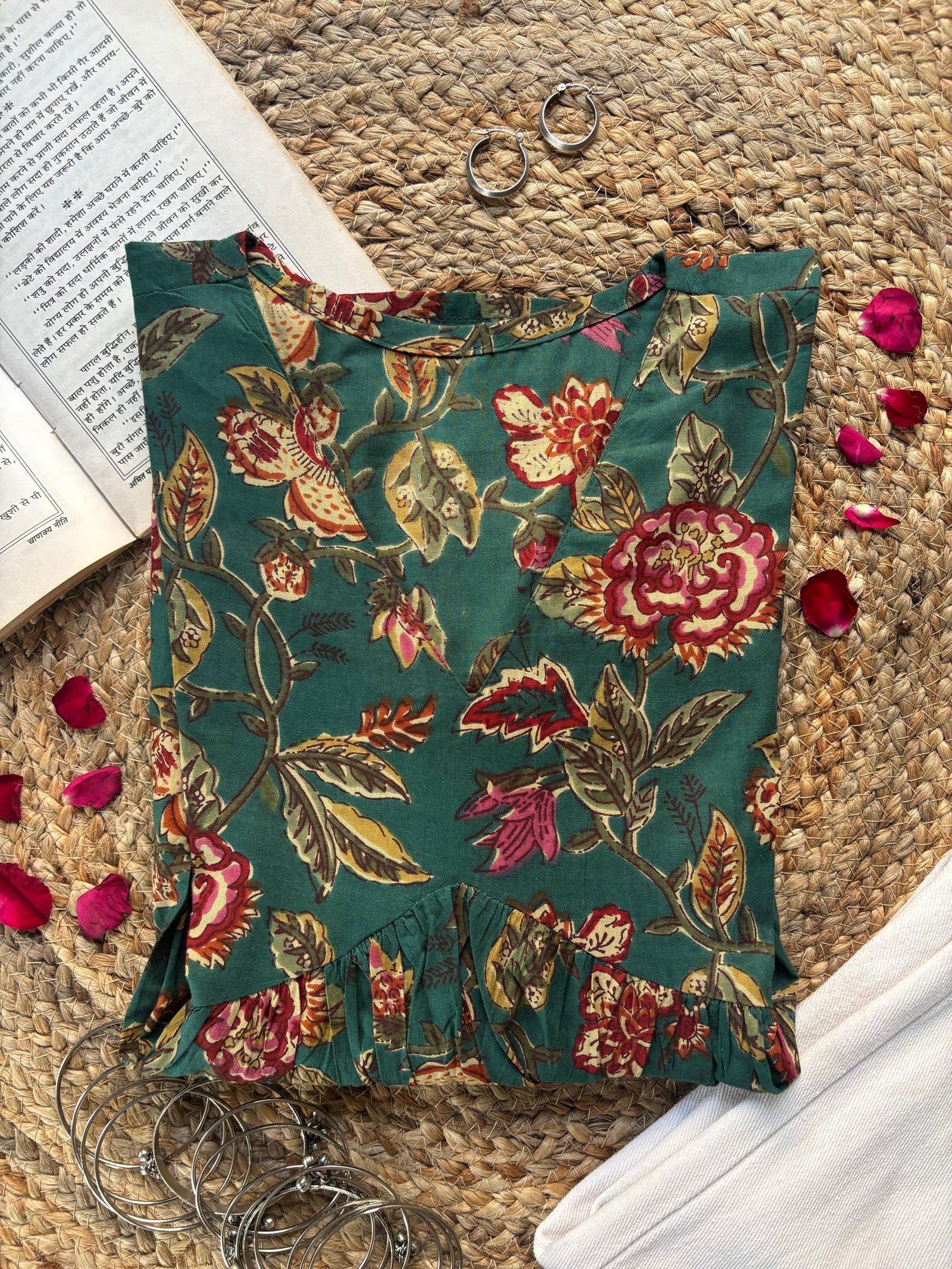 Step into effortless style with this charming green floral kurti that does the heavy lifting for you. The flattering V-neck and long sleeves keep things polished, while the playful pleated peplum adds just the right amount of personality. Hand-blocked florals in rich, moody tones make every wear feel special—whether you're heading to brunch, the office, or a casual gathering.