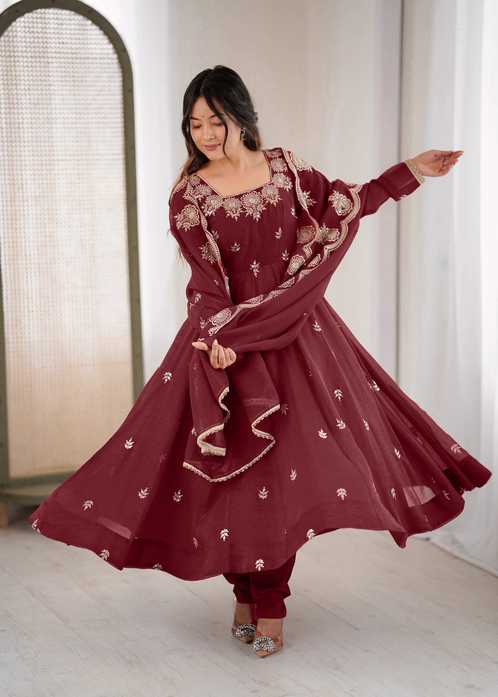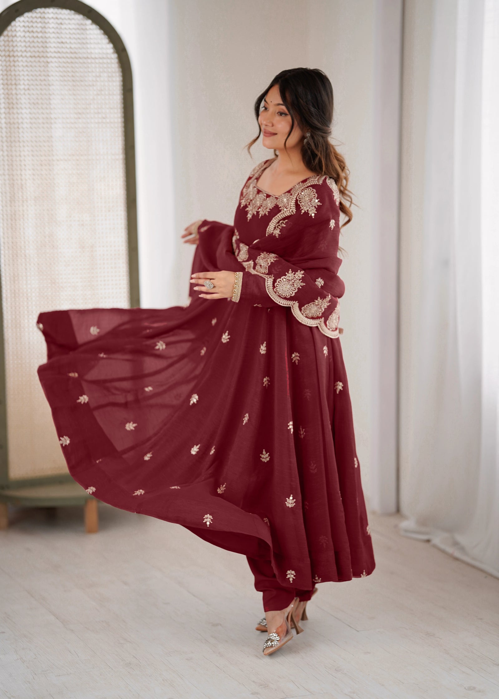 This dark maroon Roman silk gown embodies refined elegance through its masterful blend of traditional embroidery and contemporary sequin detailing. The luxurious silk fabric offers a graceful drape that flatters the form, while intricate needlework and shimmering embellishments create visual depth and movement.