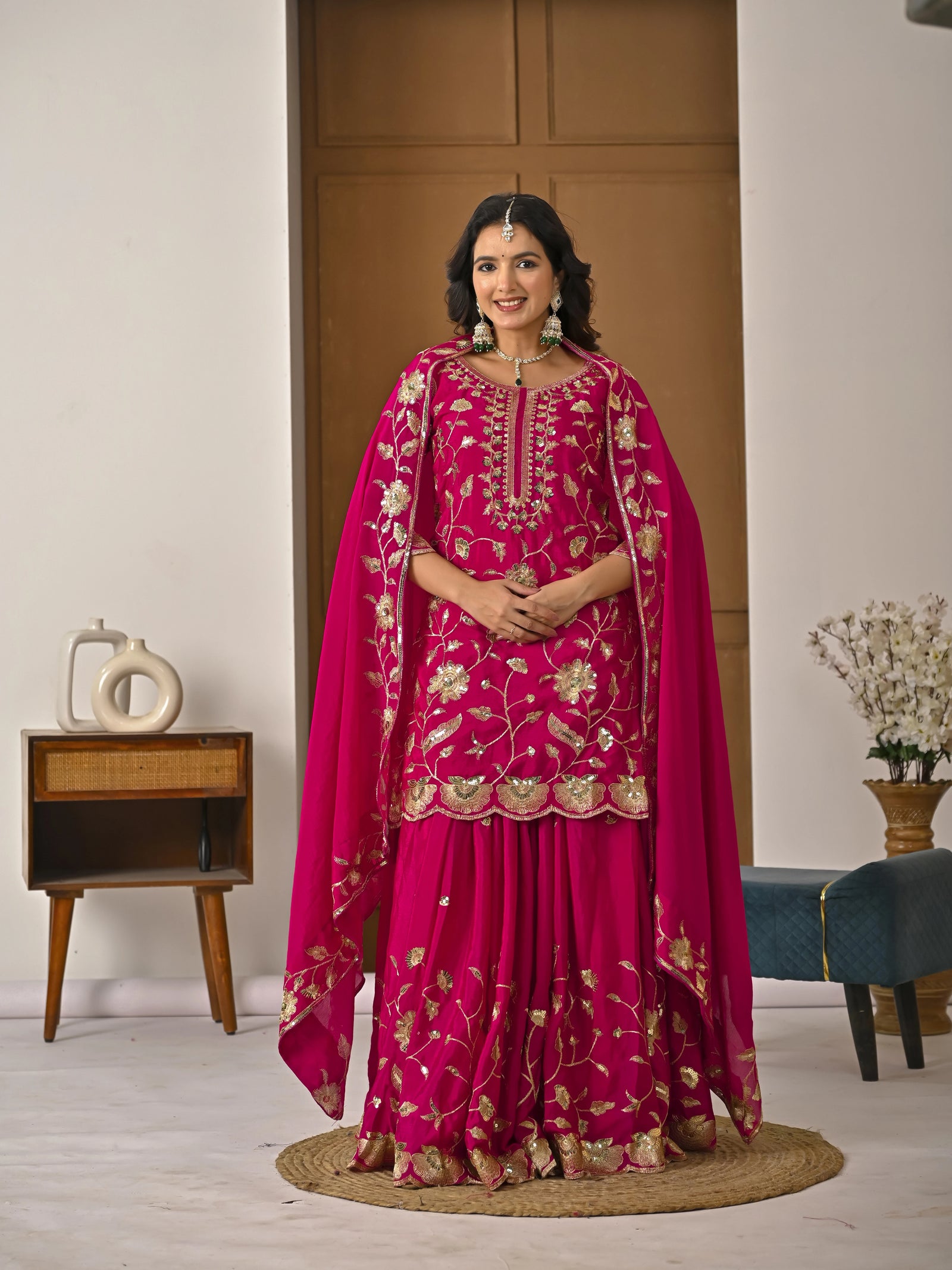 This dark pink lehenga in premium chinon silk showcases intricate sequin embroidery that captures light with subtle sophistication. The naturally fluid fabric offers ease of movement while maintaining an air of refined luxury, making it ideal for brides seeking understated elegance.