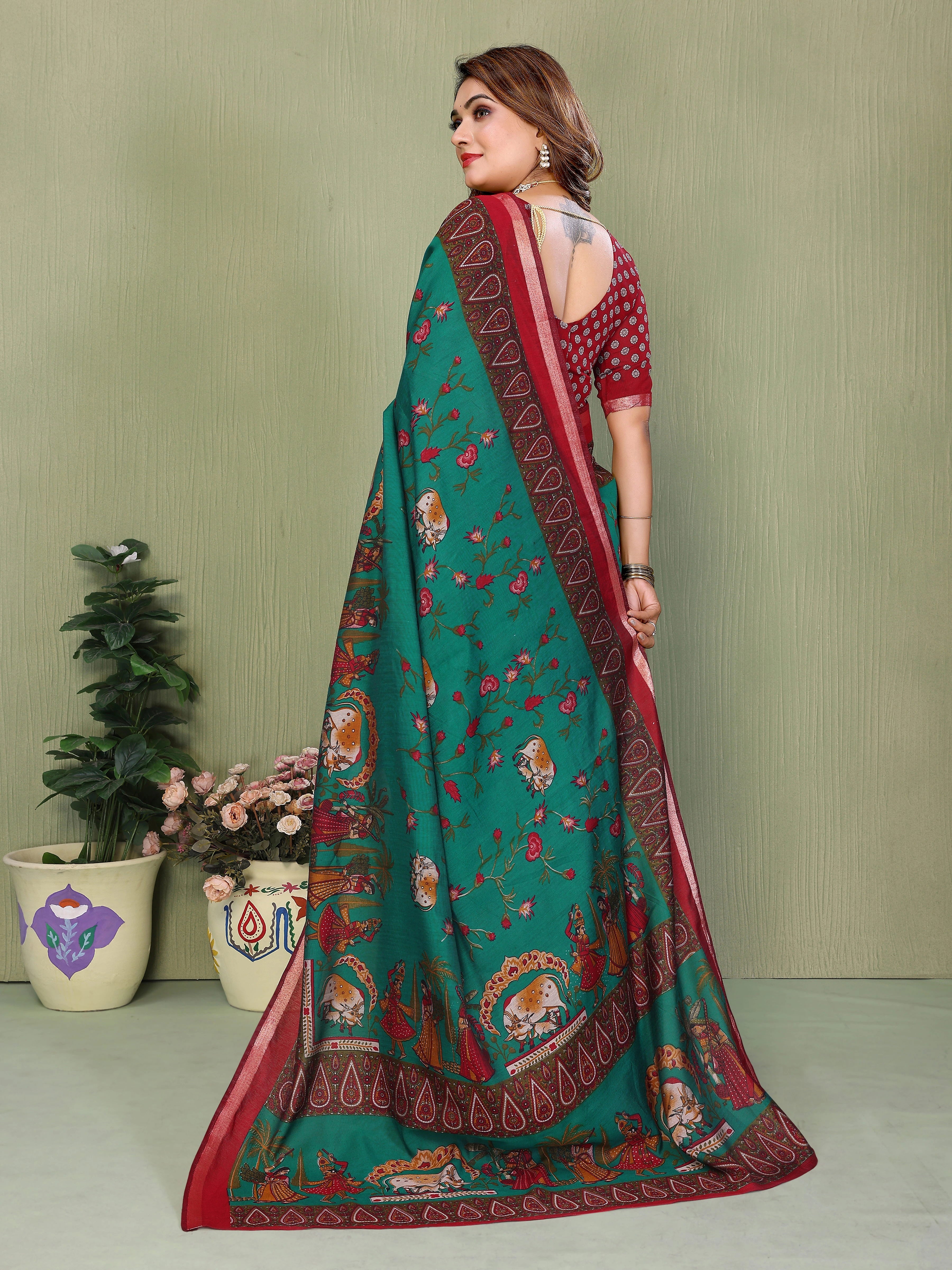 Discover understated luxury in this Green Kalamkari Print Mul Cotton Saree, where centuries-old hand-painting traditions meet contemporary elegance. Delicate Kalamkari artistry blooms across soft mul cotton in sophisticated shades of green, offering a refined aesthetic for discerning occasions.