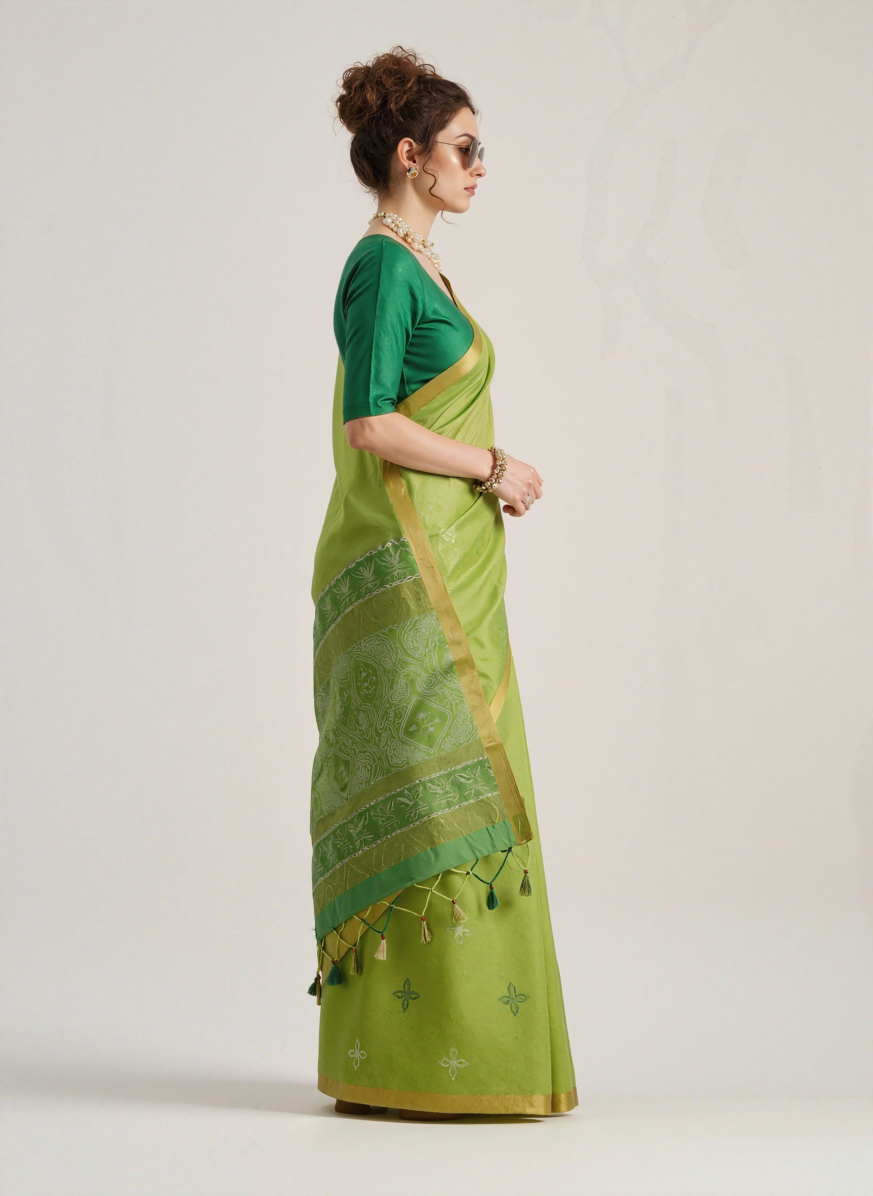 Elevate your elegance with this Green Weaving Patola Silk Saree, crafted with exquisite weaving techniques that showcase rich heritage artistry. The vibrant green shade complements the intricate silk patterns, offering a luxurious drape that enhances your silhouette beautifully. Perfect for special occasions, this saree blends traditional craftsmanship with timeless sophistication.