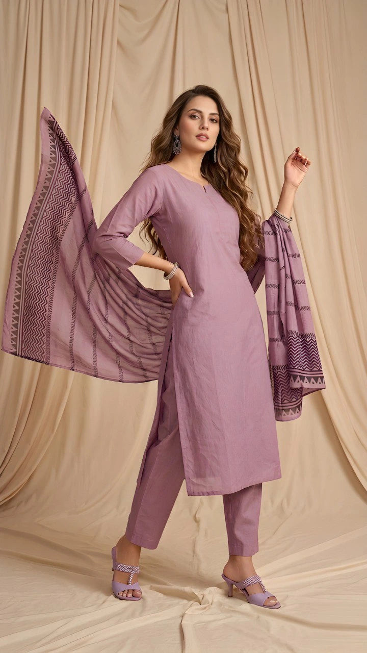 Elevate your everyday style with this charming Lavender-Pink Digital-Print Cotton Kurti. Crafted from soft, breathable cotton, this three-piece ensemble features a beautifully printed design that brings contemporary flair to traditional wear.
