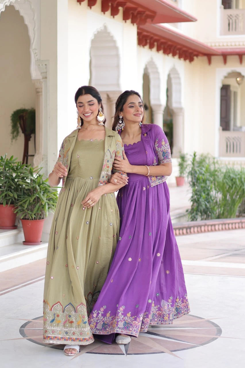 Light Pista Sequins, Thread & Zari Embroidery Work Vichitra Silk Gown. Elevate your ethnic wardrobe with this exquisite gown crafted from premium Vichitra silk. Adorned with intricate sequin detailing, delicate threadwork, and lustrous zari embroidery, this piece seamlessly blends traditional craftsmanship with a contemporary silhouette.