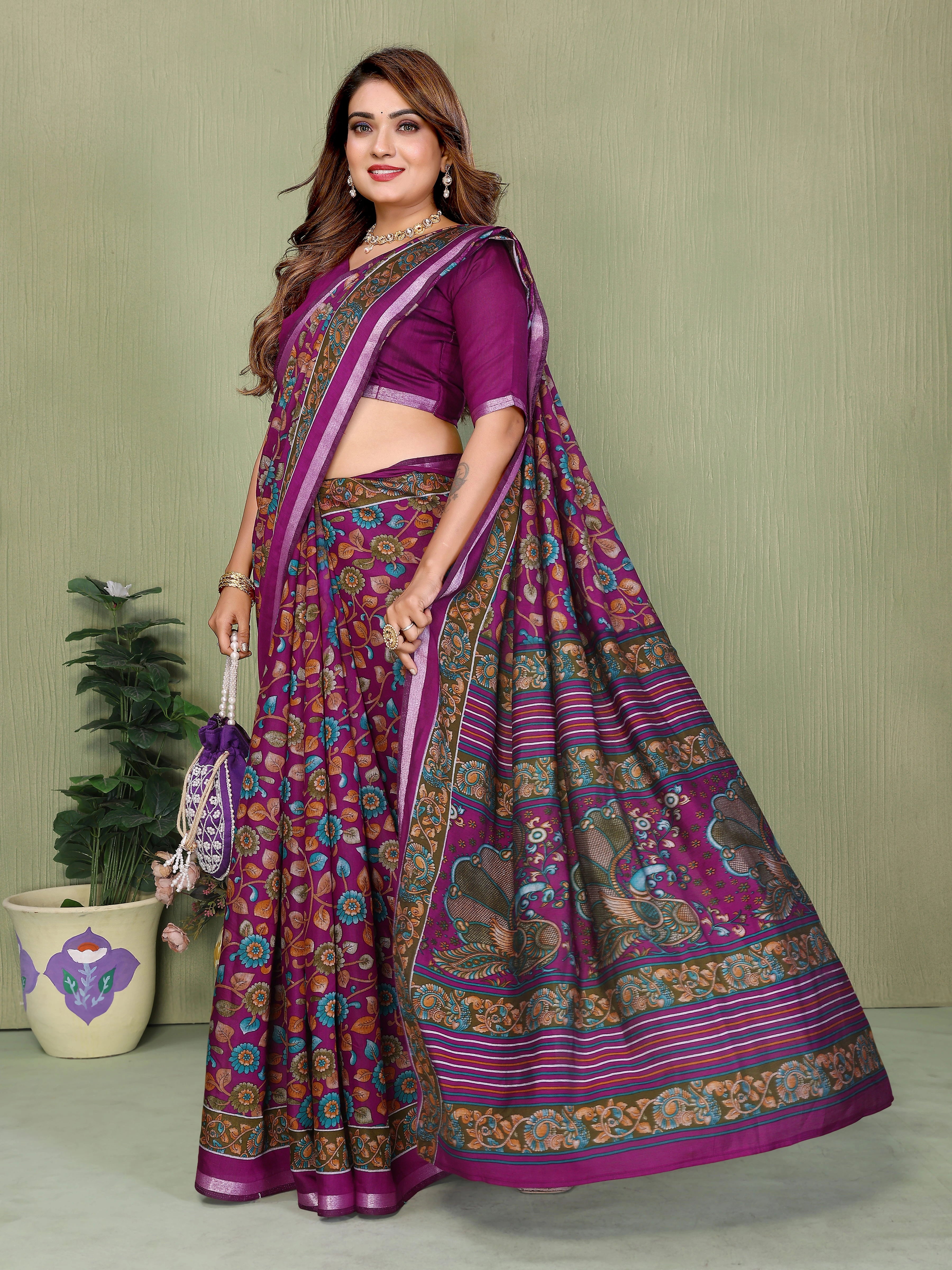 Experience the allure of this Magenta Kalamkari Print Mul Cotton Saree, a stunning testament to classical Indian weaving traditions. Adorned with intricate Kalamkari patterns in captivating magenta, the saree showcases meticulous hand-painted artistry that commands attention with understated grace.