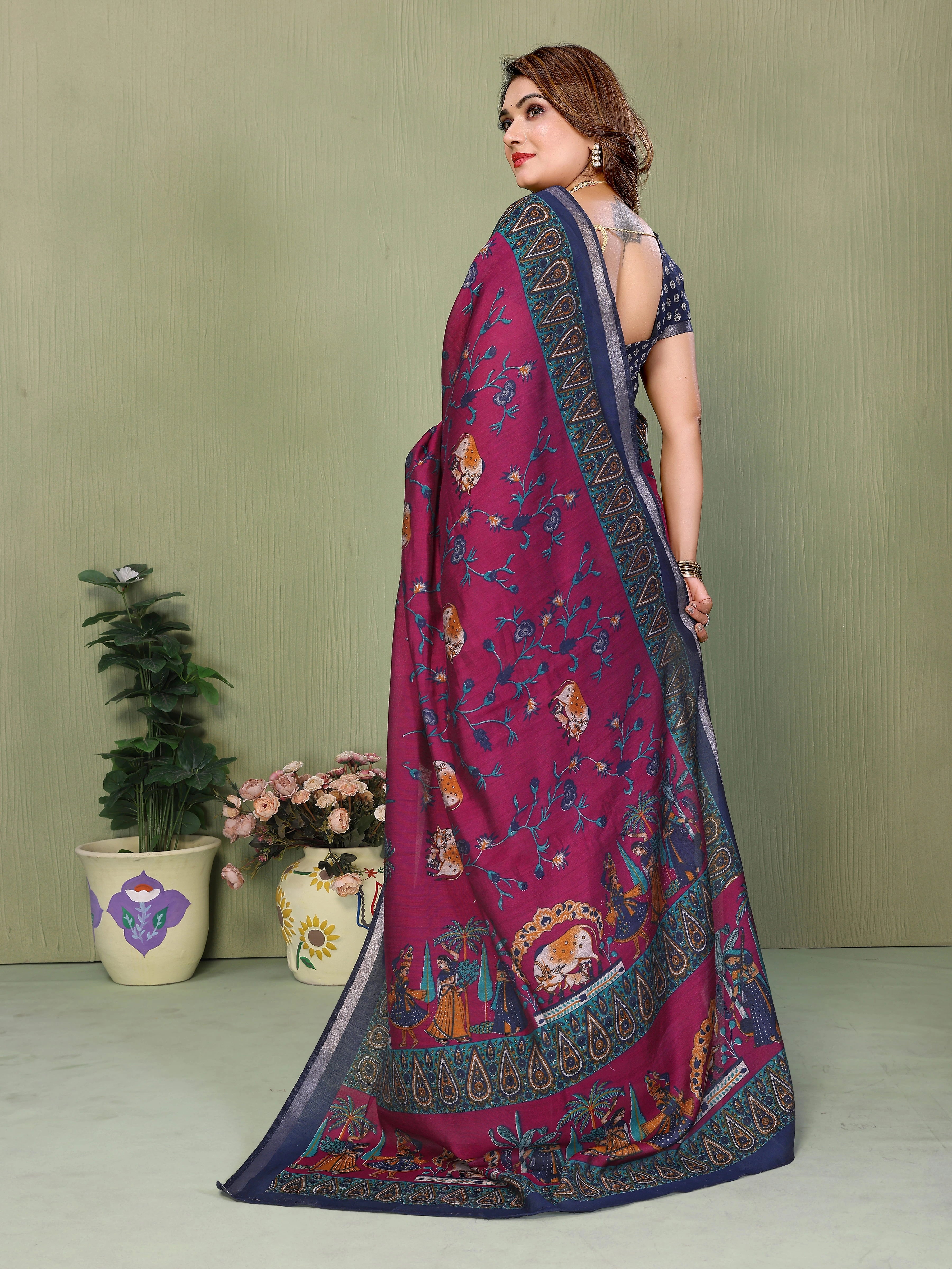 Elevate your ethnic wardrobe with this magenta mul cotton saree, where traditional kalamkari artistry meets contemporary sophistication. The hand-painted motifs showcase centuries-old craftsmanship, while the lightweight mul cotton ensures comfort through extended wear.
