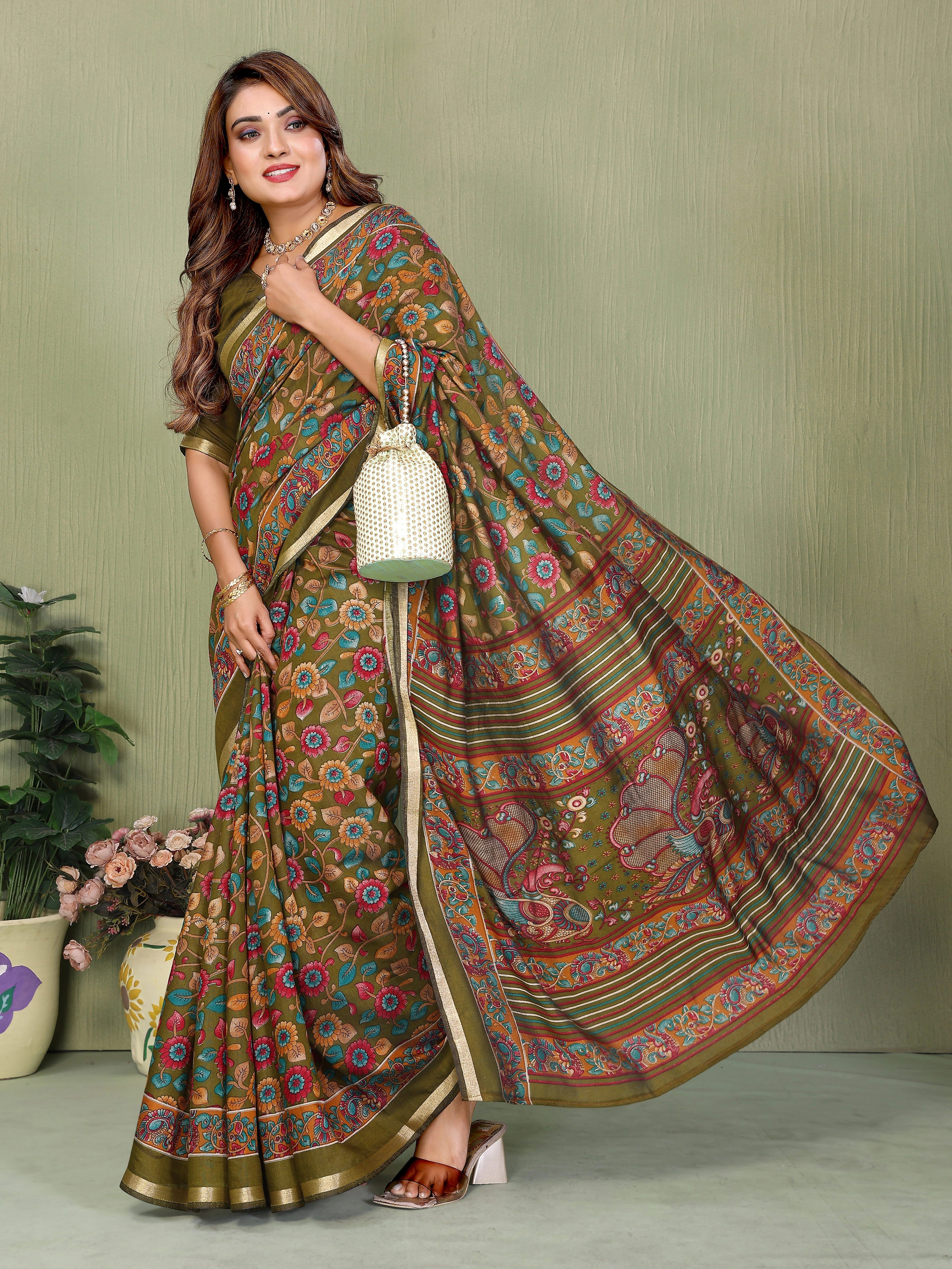 Elevate your wardrobe with this enchanting Mehendi Kalamkari Print Mul Cotton Saree, where tradition meets contemporary elegance. Spun from pure mul cotton, this saree offers superior comfort and a naturally fluid drape that flatters every silhouette. The hand-painted kalamkari motifs in warm mehendi shades showcase the artistry of master craftsmen, making each saree uniquely special.