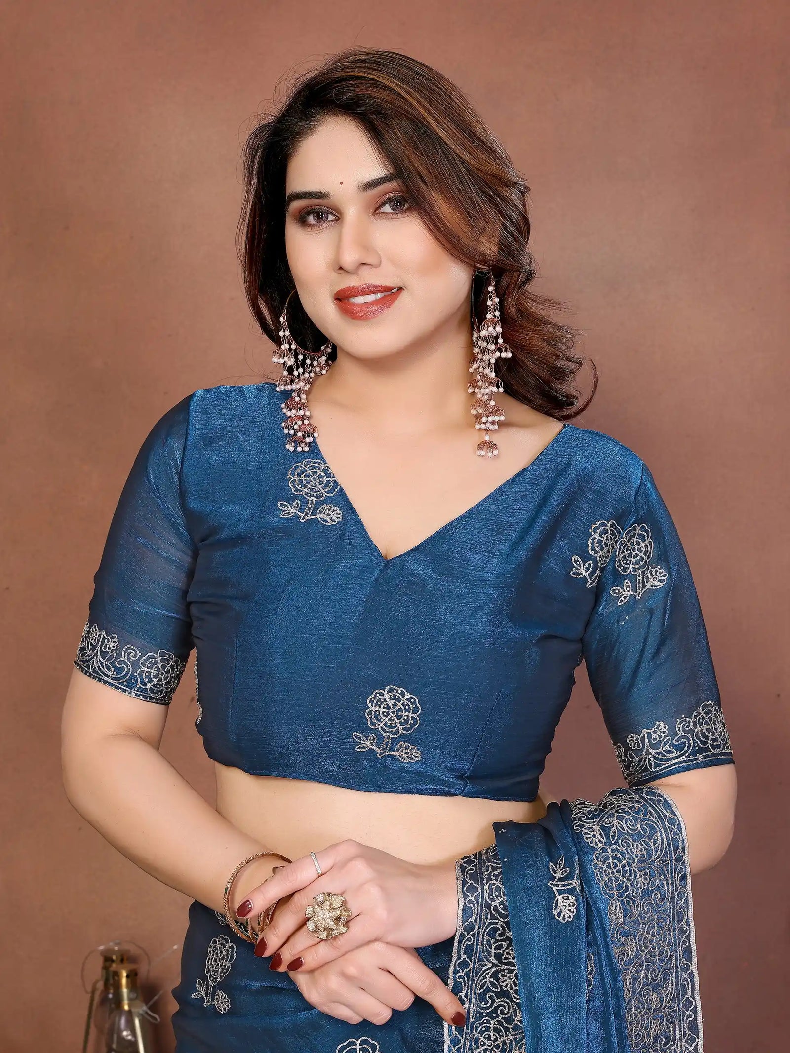 Elevate your ethnic wardrobe with this Navy Blue Embroidered Fendy Chiffon Silk Saree. Crafted from luxurious fendy chiffon silk, this piece combines traditional embroidered detailing on both the saree and border for timeless elegance.