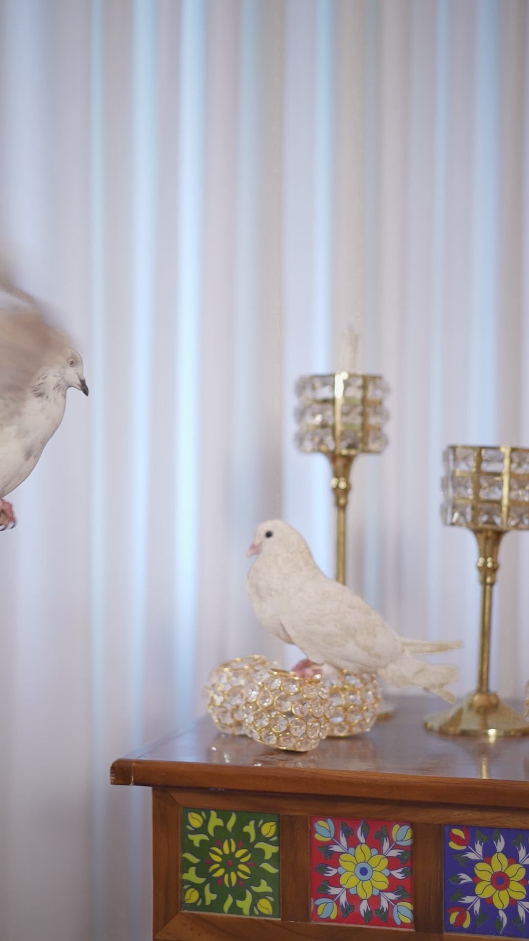 Woman in a navy blue embroidered outfit standing in a decorated room with a table and decorative items.