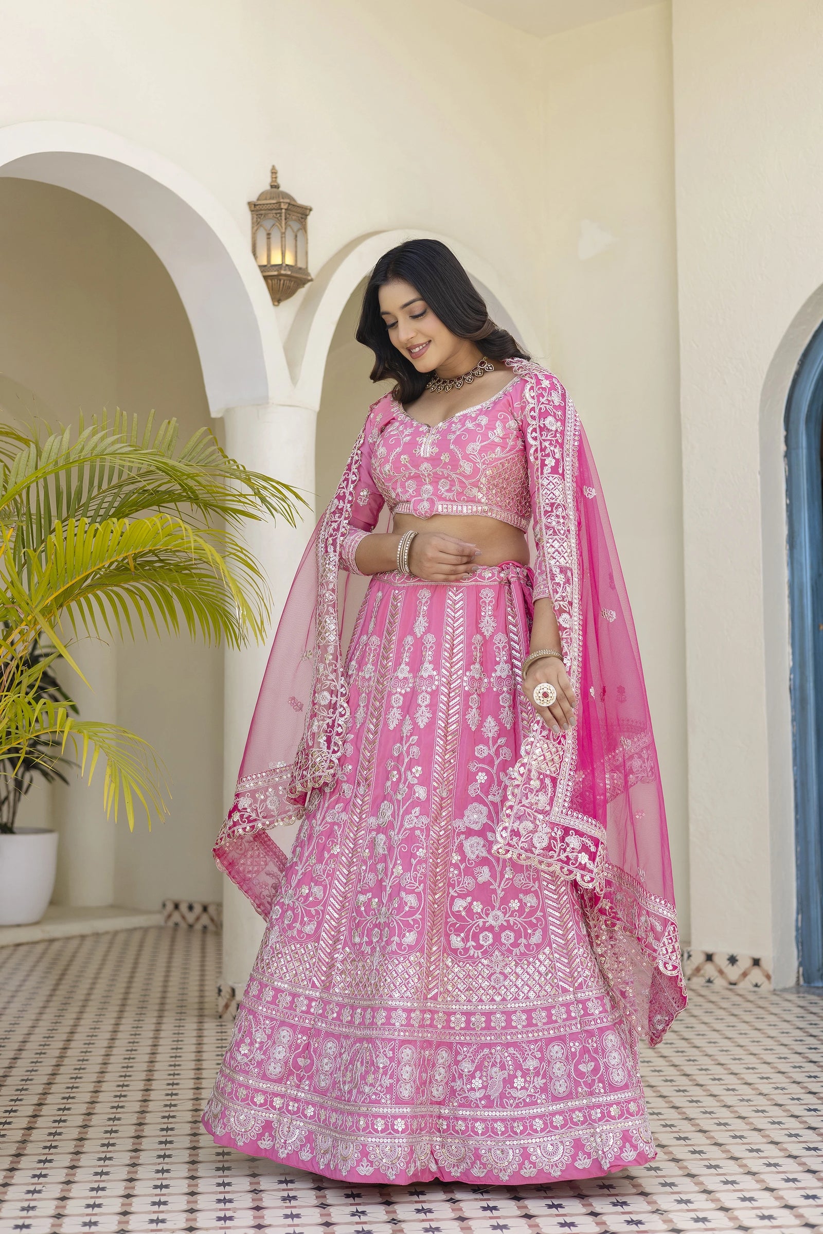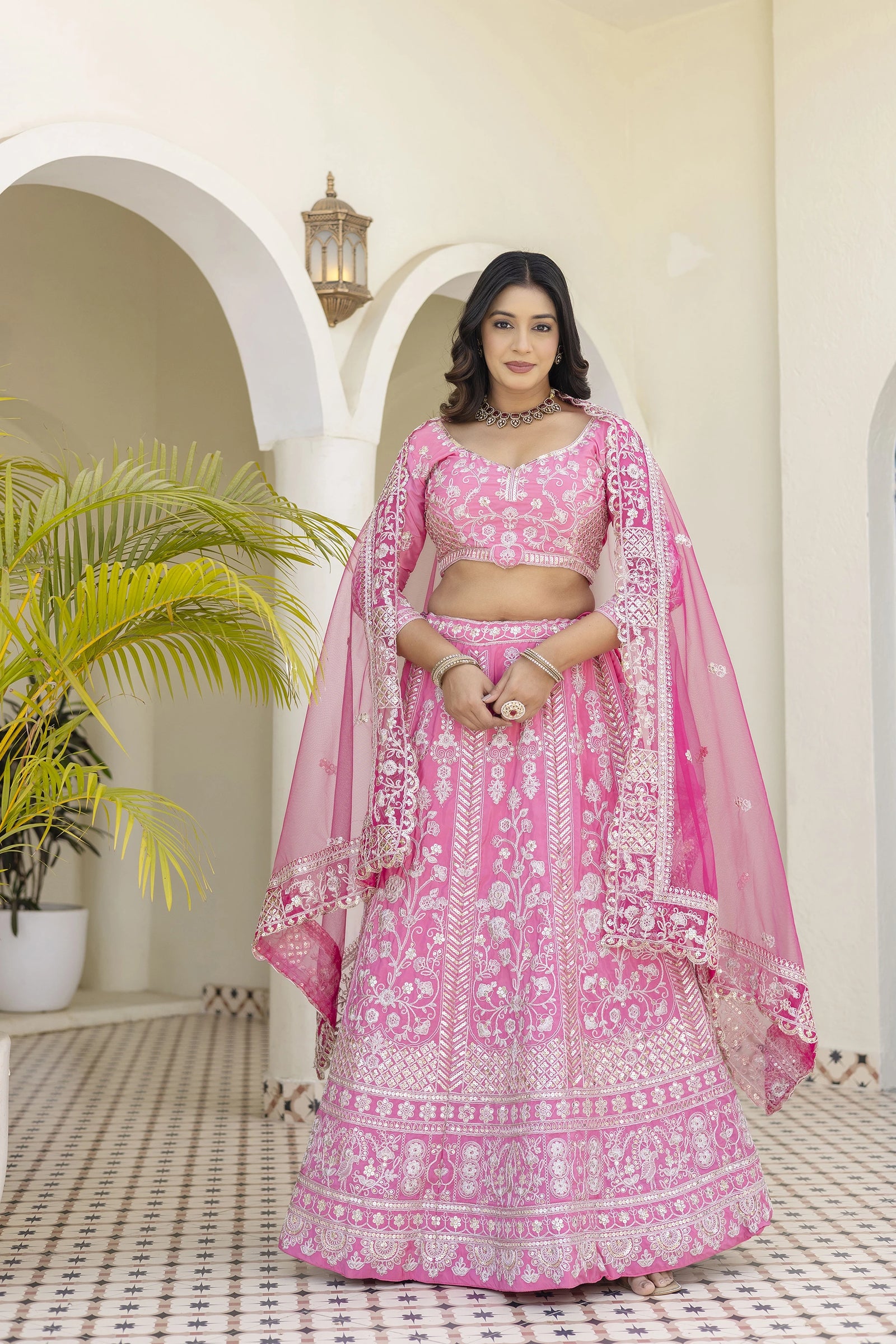 This pink lehenga exemplifies refined craftsmanship through its meticulous sequined and zari-coded embroidery, executed with the precision that distinguishes premium ethnic wear. The natural crêpe silk foundation provides superior drape characteristics and inherent breathability critical for extended wear during multi-event celebrations.