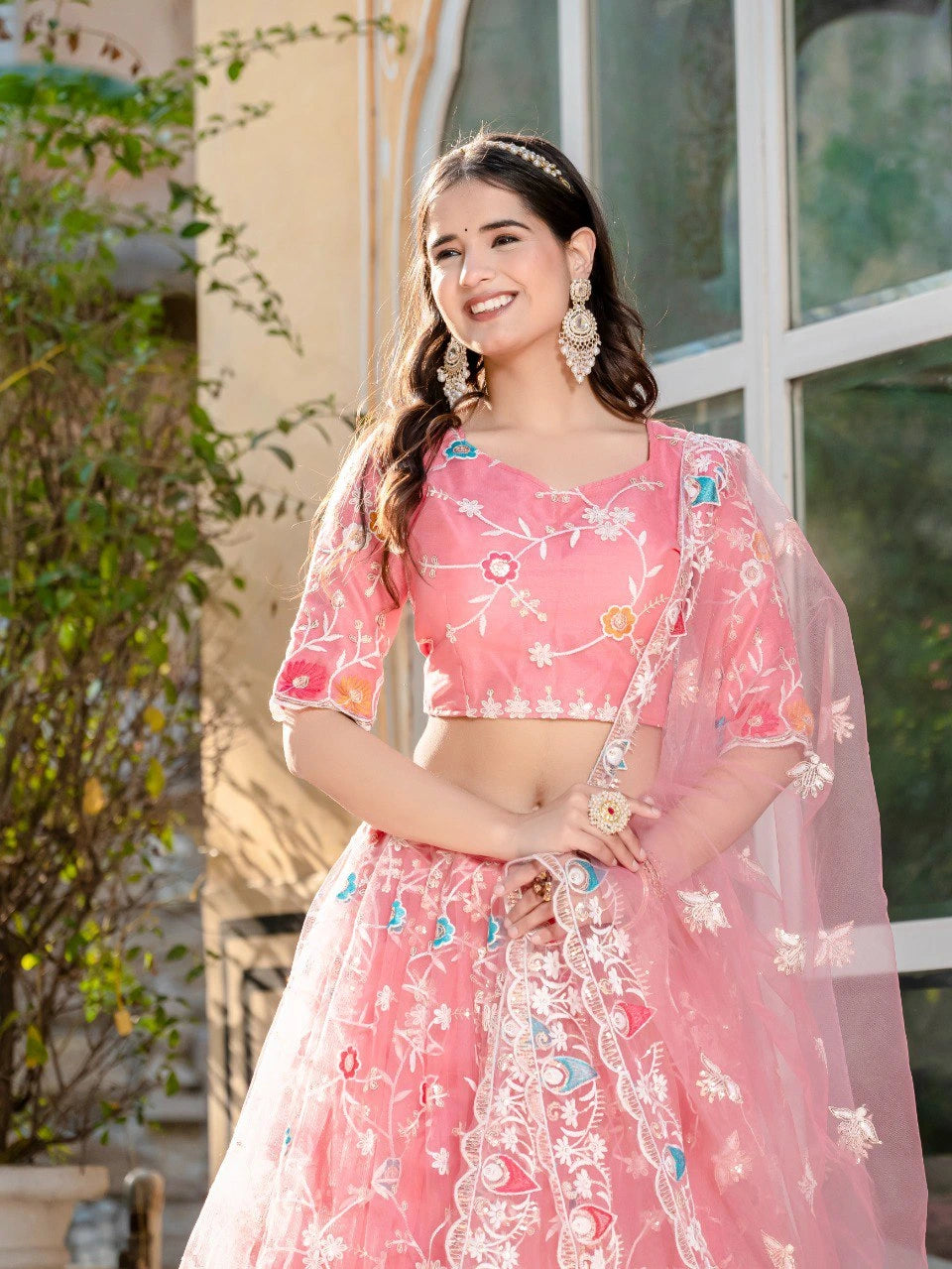 Pink Sequins & Thread Embroidered Lehenga Radiate elegance in this stunning lehenga, where delicate sequins and intricate thread embroidery come together to create a show-stopping ensemble. The shimmering embellishments catch light beautifully, making this piece perfect for weddings, celebrations, and special occasions.
