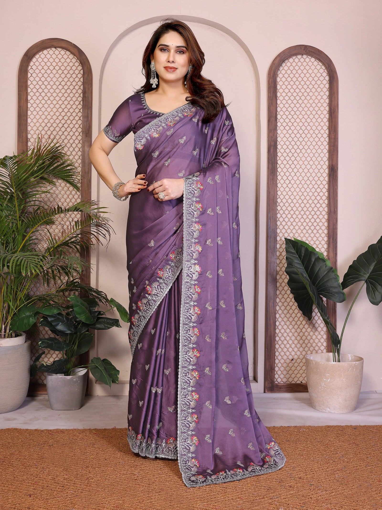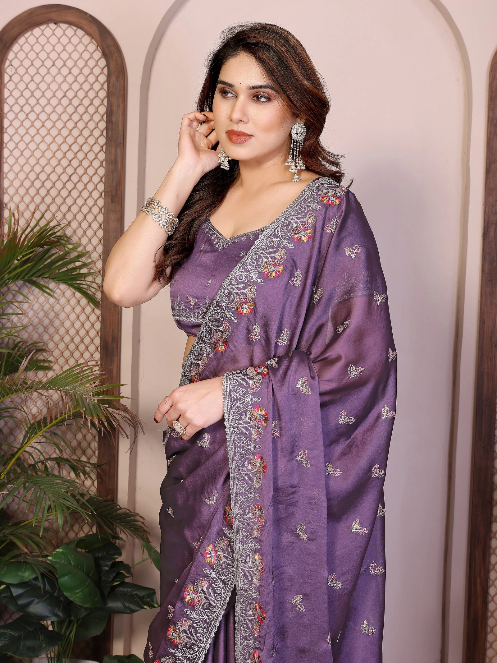 Drape yourself in timeless elegance with this Purple Embroidered Rangoli Silk Saree. Crafted from luxurious rangoli silk, this piece features intricate embroidered detailing and a refined lace-work border that captures traditional artistry. The saree comes complete with a coordinating blouse piece in the same premium silk fabric, ensuring a seamless, polished look.