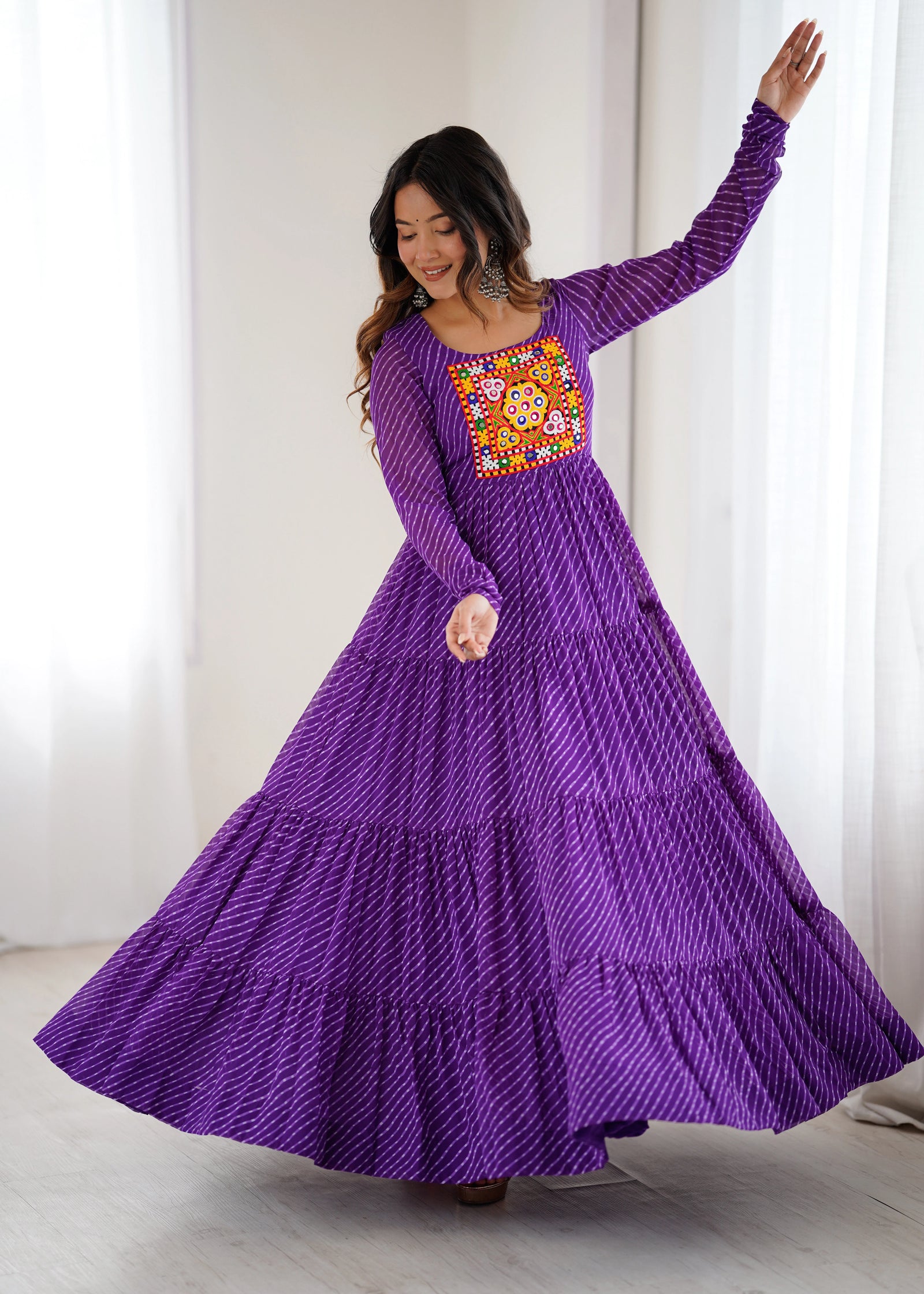 Purple Gamthi with Laheriya Print Fox Georgette Gown