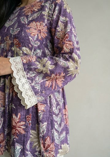 This elegant short kurti showcases a rich purple canvas enhanced by a delicate multicoloured floral print, creating a refined yet approachable aesthetic. The flattering V-neckline and softly gathered yoke detail provide a graceful silhouette that complements various body types. Crafted from breathable fabric, it transitions seamlessly from casual daytime wear to relaxed evening occasions, offering the comfort and sophistication that defines contemporary ethnic fashion.