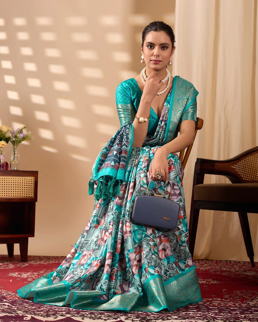 Rama Blue Artistic Abstract & Floral Digital Print Soft Lichi Silk Saree