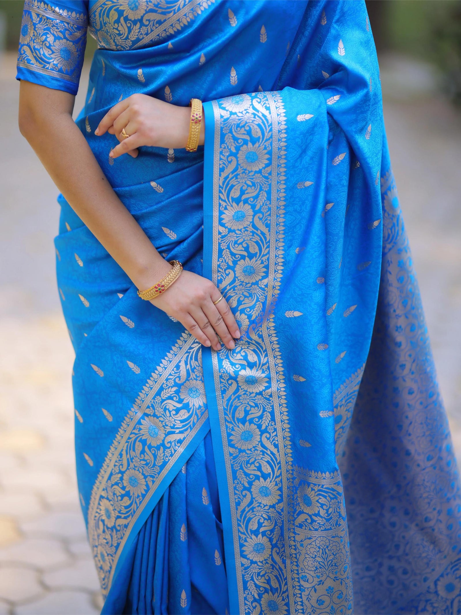 Elevate your ethnic wardrobe with this stunning Rama Blue Zari Weaving Banarasi Silk Saree, a timeless piece that celebrates traditional craftsmanship. Woven from luxurious silk, this saree features intricate zari detailing that catches light beautifully, creating an elegant shimmer perfect for weddings, festivals, and special occasions.