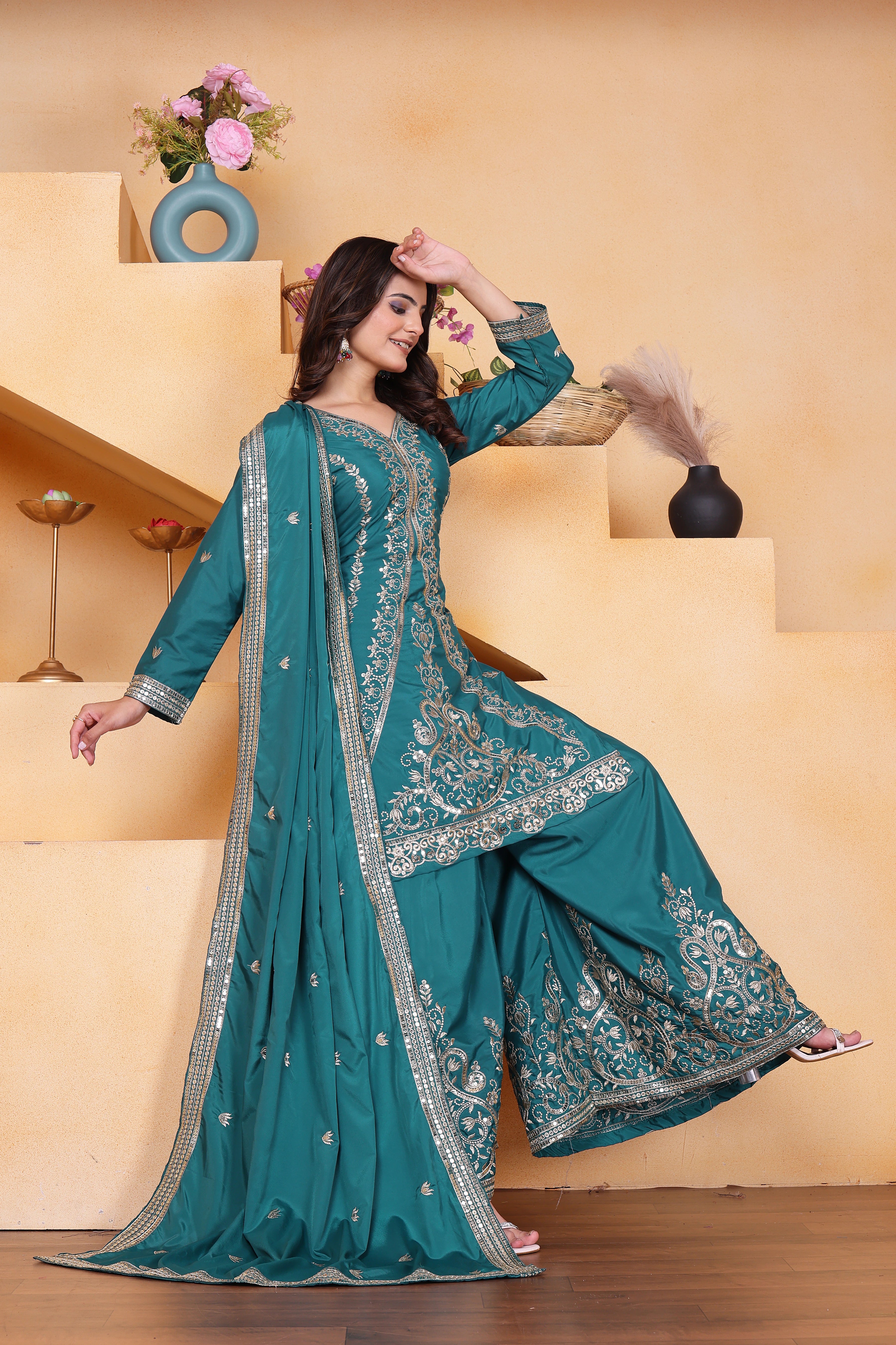 This Rama blue crepe suit showcases refined embroidery, featuring delicate sequin detailing that catches the light with understated elegance. Constructed from natural crepe fabric, the ensemble offers a graceful drape and breathable comfort ideal for weddings, festivals, and formal gatherings.