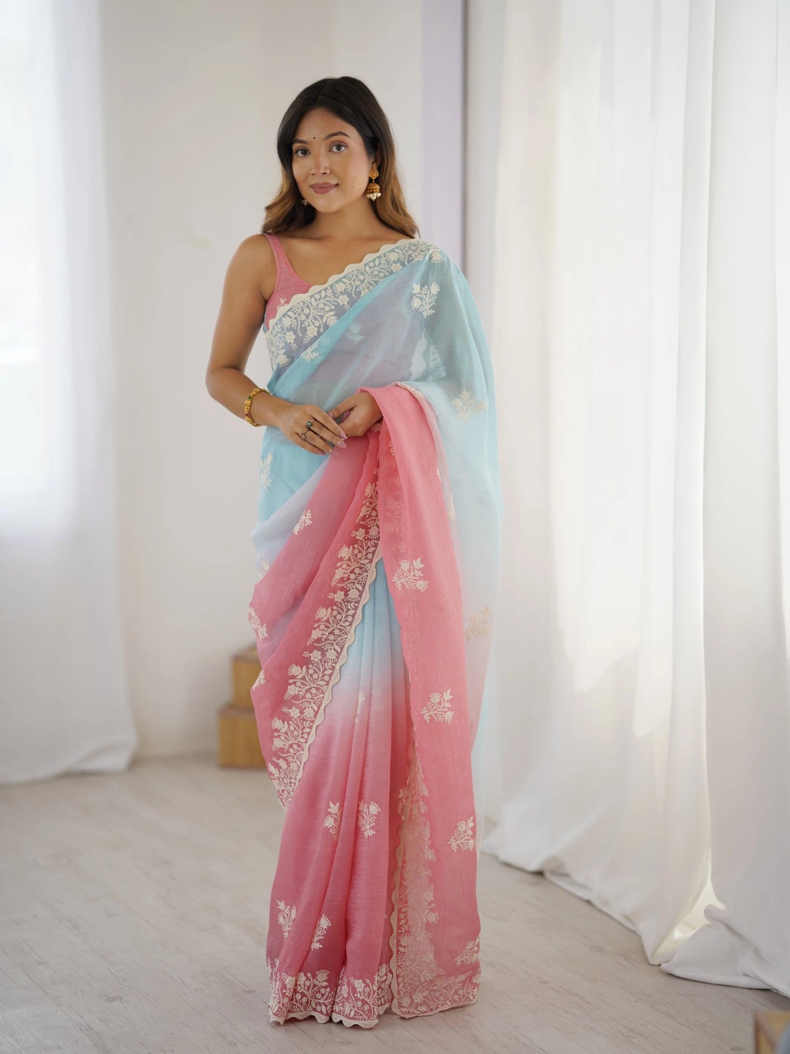 Sky blue cotton saree with delicate pink thread embroidery. Breathable, comfortable, and perfect for casual gatherings or festive occasions. A timeless piece celebrating traditional craftsmanship with contemporary appeal.