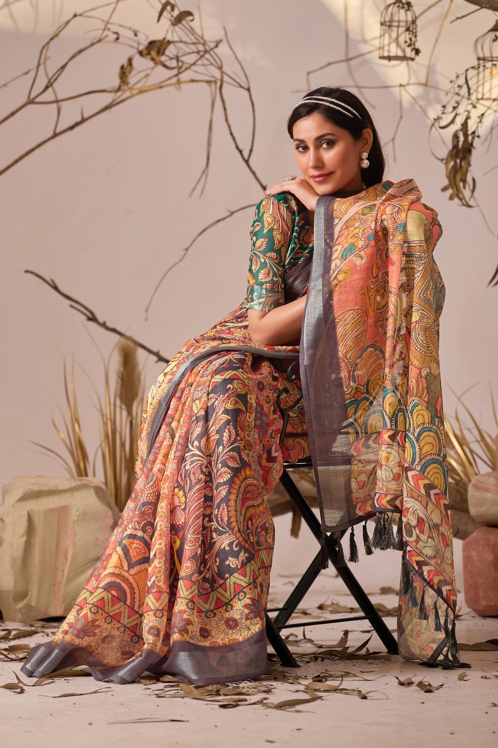 This linen cotton saree captures understated luxury through its harmonious blend of soft peach and intricate digital floral-ethnic prints. The natural fiber composition provides superior comfort and authentic drape, while the layered print design—marrying botanical precision with traditional motifs—elevates any occasion. Whether styled for celebrations or refined everyday moments, this piece reflects a discerning approach to ethnic fashion. The warm peach undertone enhances versatility across complexions and