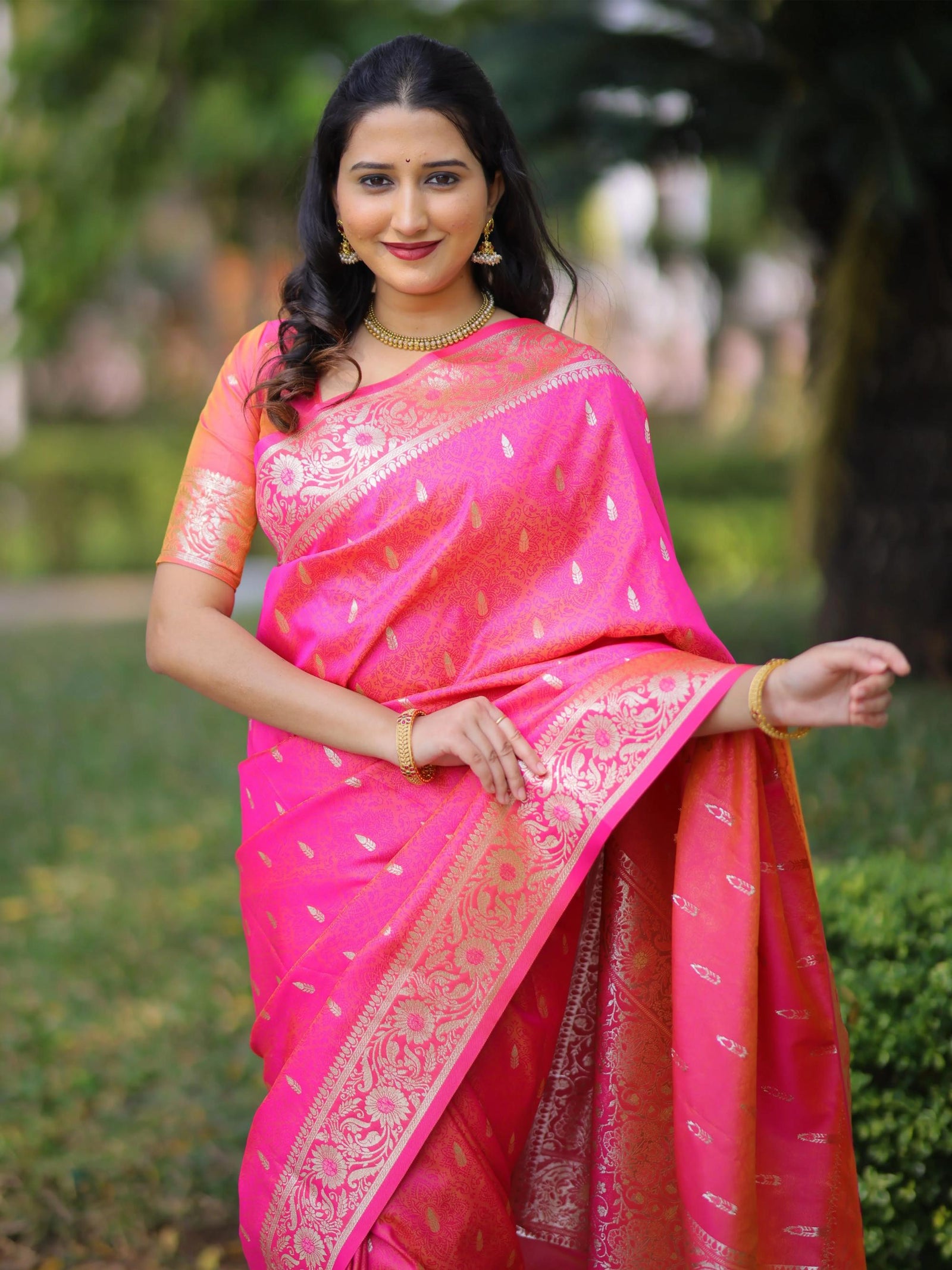 Embrace timeless beauty with this Tulip Pink Zari Weaving Banarasi Silk Saree, a masterpiece of traditional Indian weaving. Handcrafted from sumptuous silk, this saree features intricate zari embellishments that dance across the fabric, creating an ethereal shimmer with every drape.